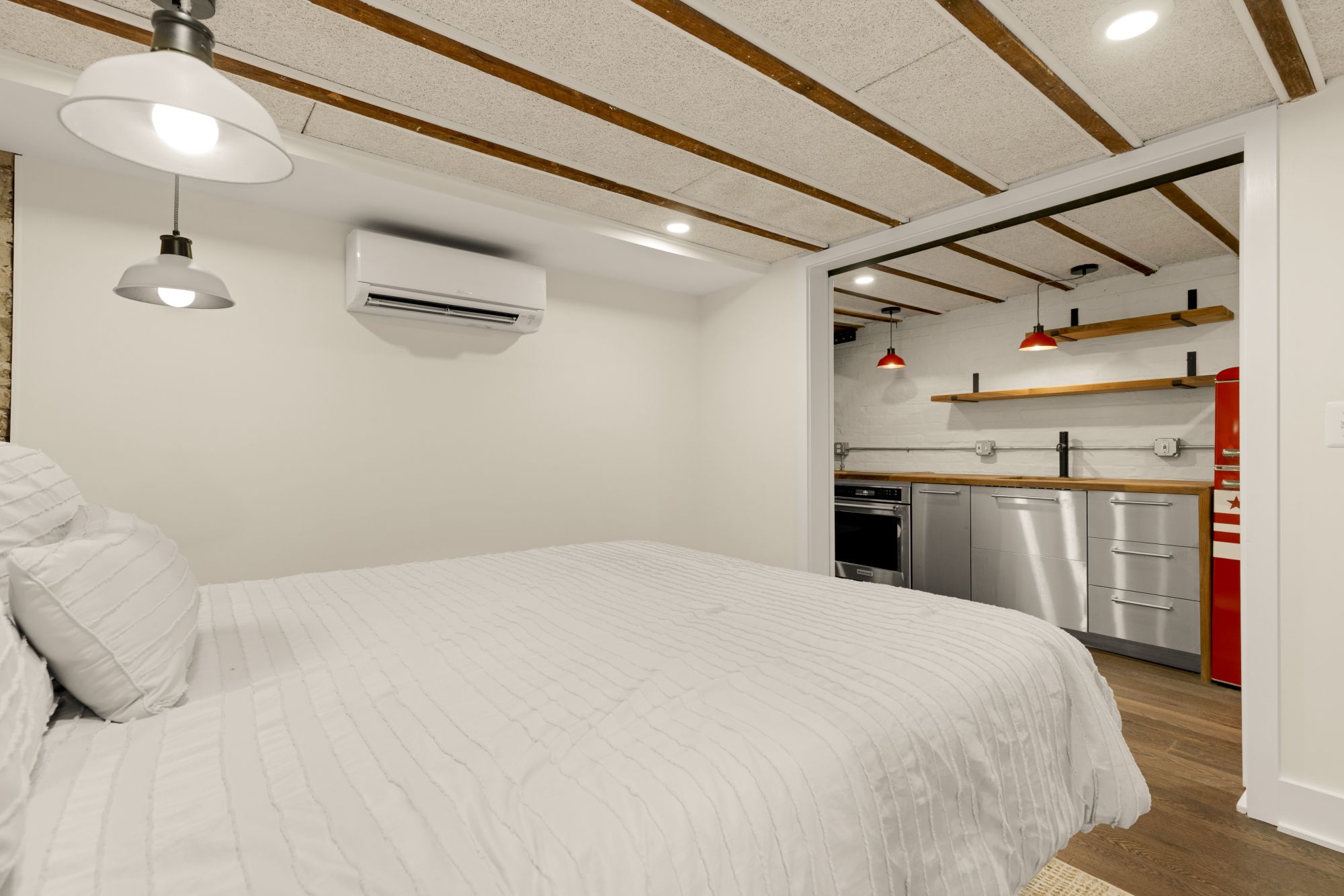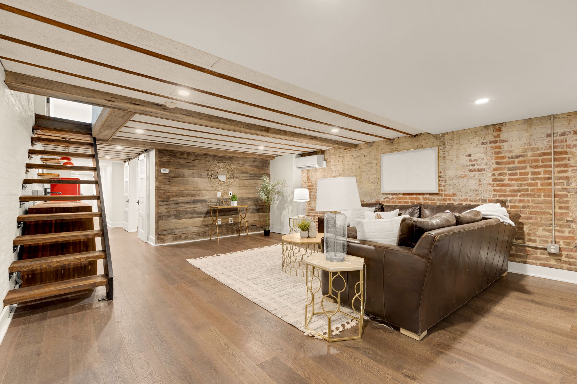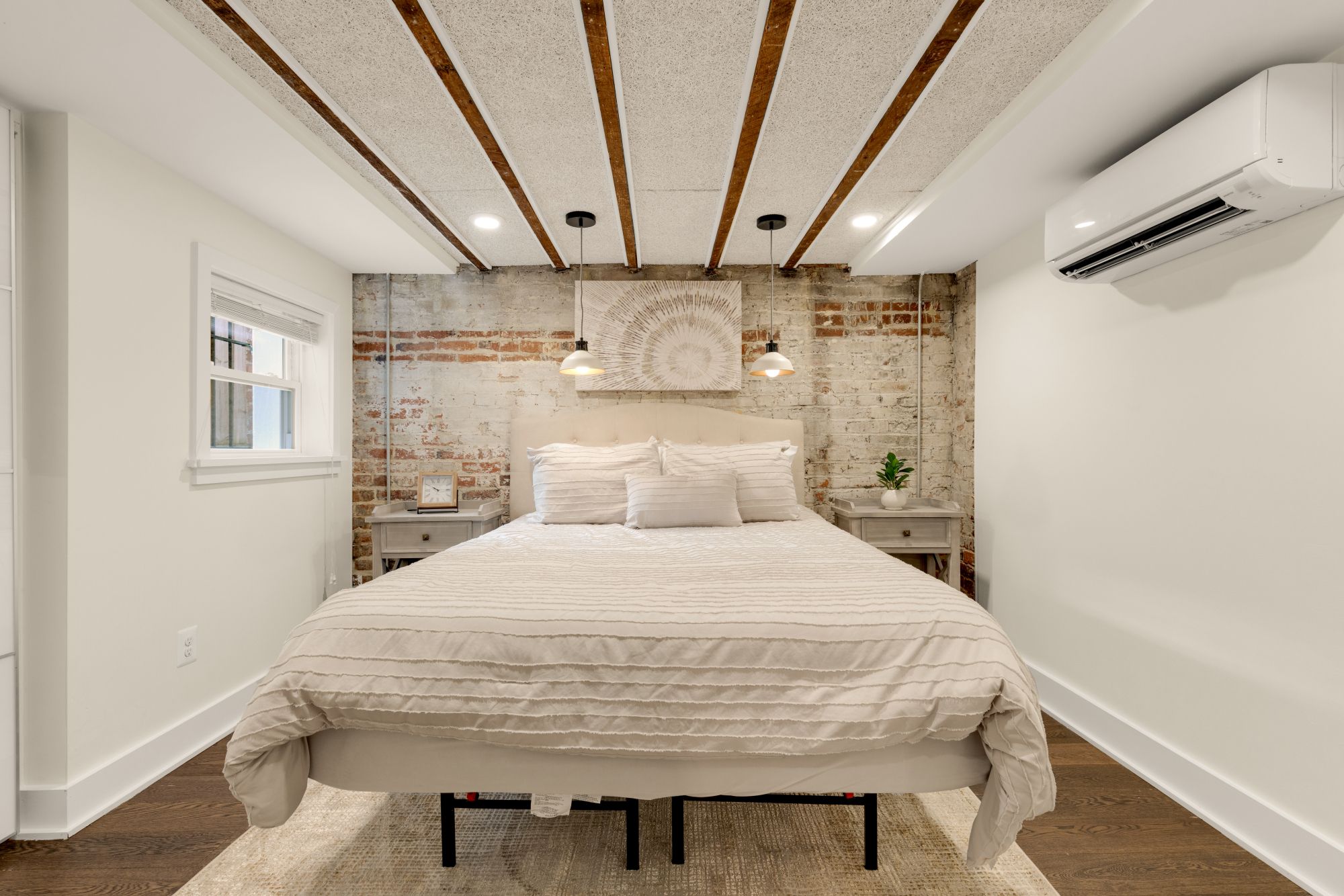 Upstairs, three true bedrooms and two full baths offer real breathing room. The primary suite has a clean, modern en suite with floor-to-ceiling tile and a spacious vanity. The front bedroom captures golden hour light and street views, while the back bedroom faces east for morning sun. Downstairs, a fully finished lower level adds flexibility: exposed brick, a full kitchenette, private entrance, and its own bed and bath make it ideal for guests, in-laws, or passive income. The seller is also willing to provide plans for a raised deck above the rear parking, modeled after the neighboring property, to create even more outdoor living space.