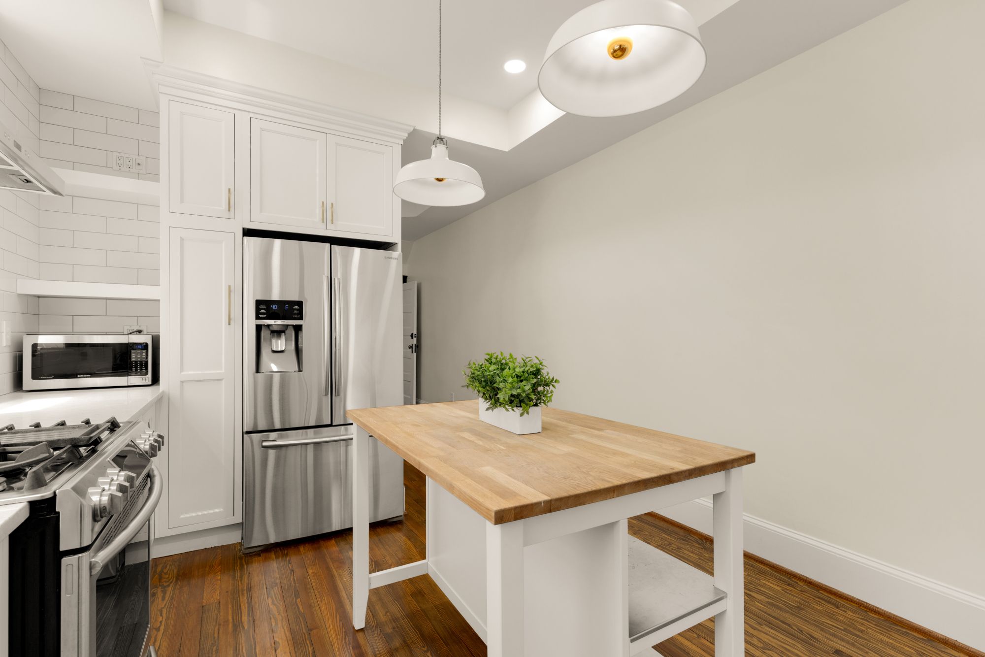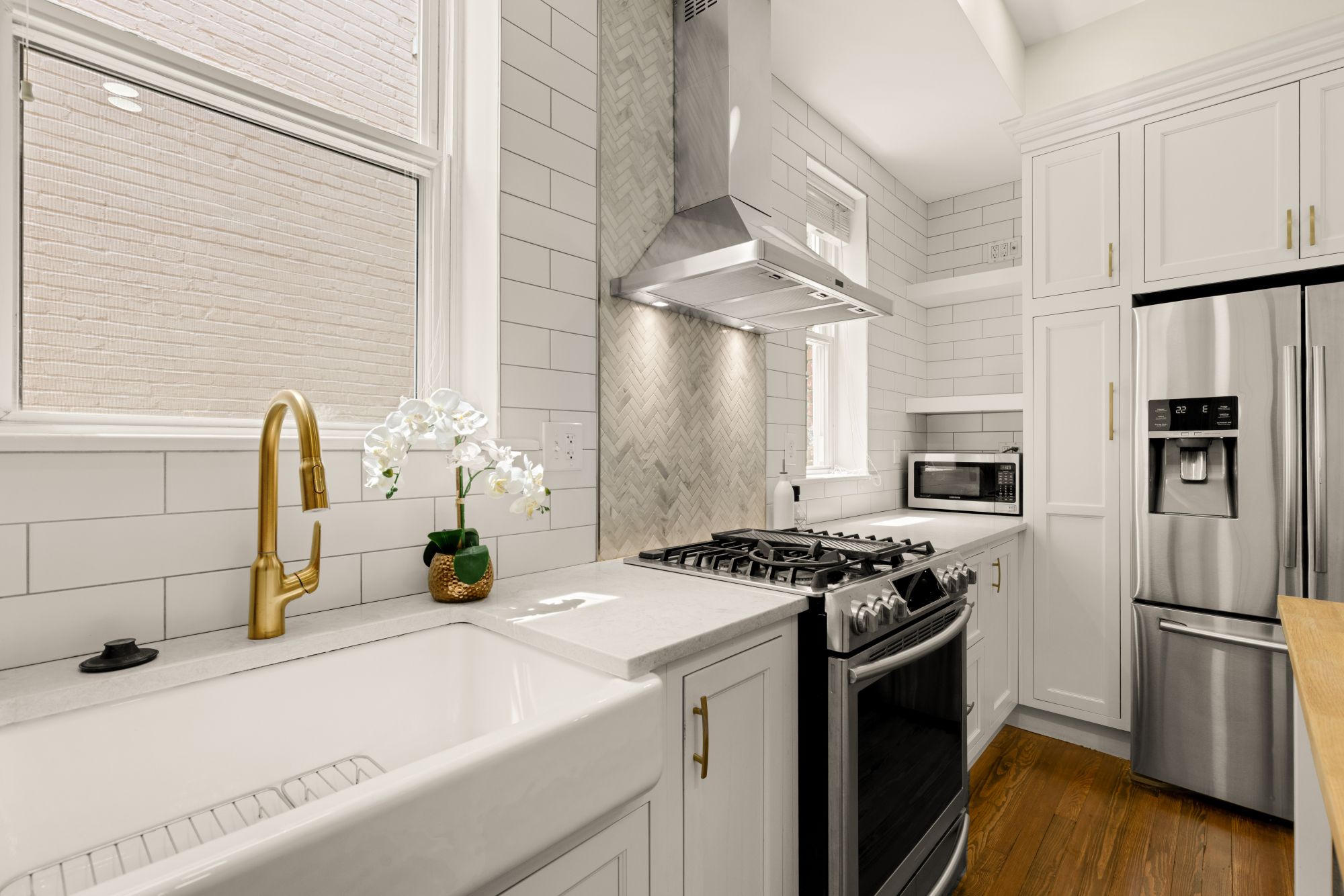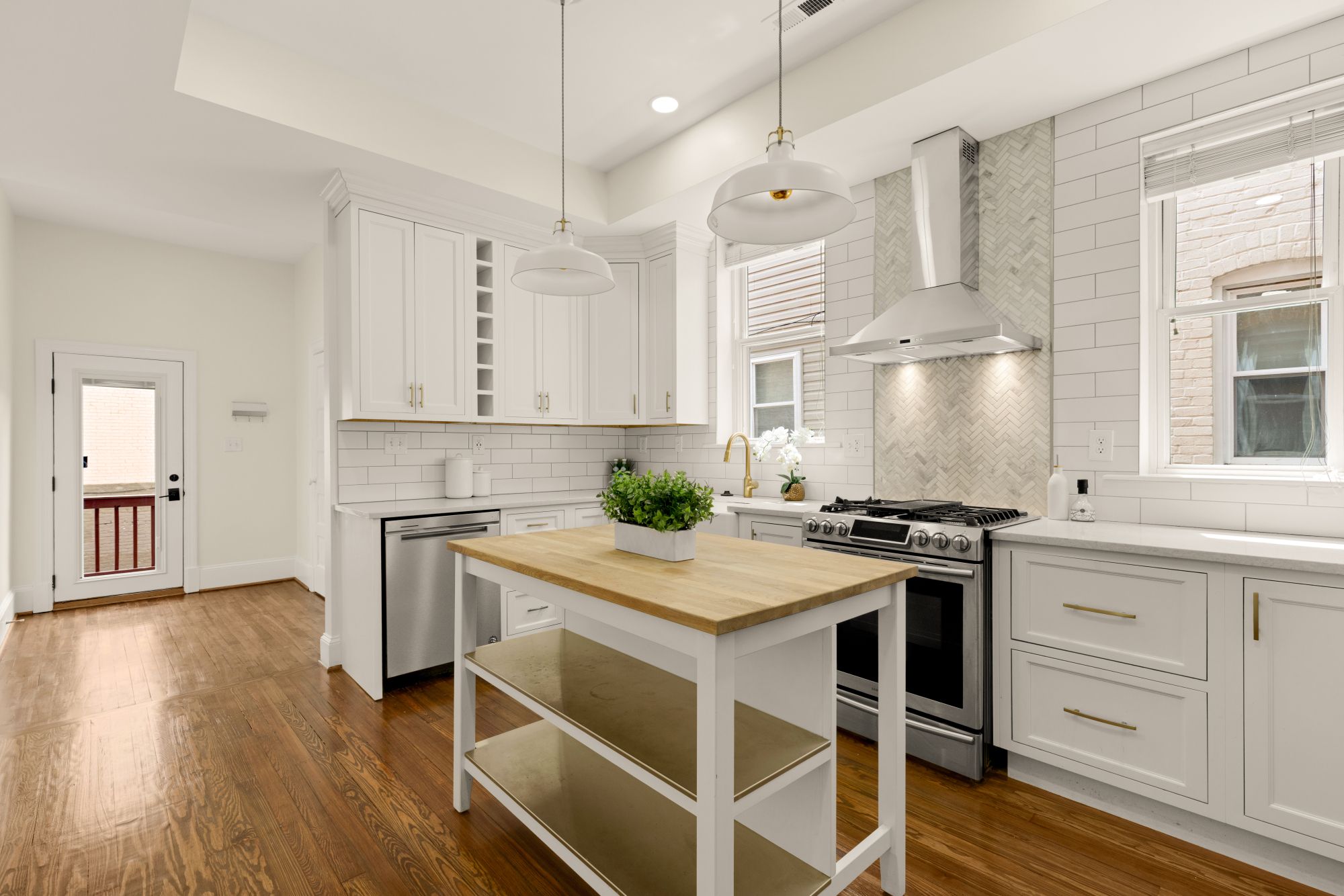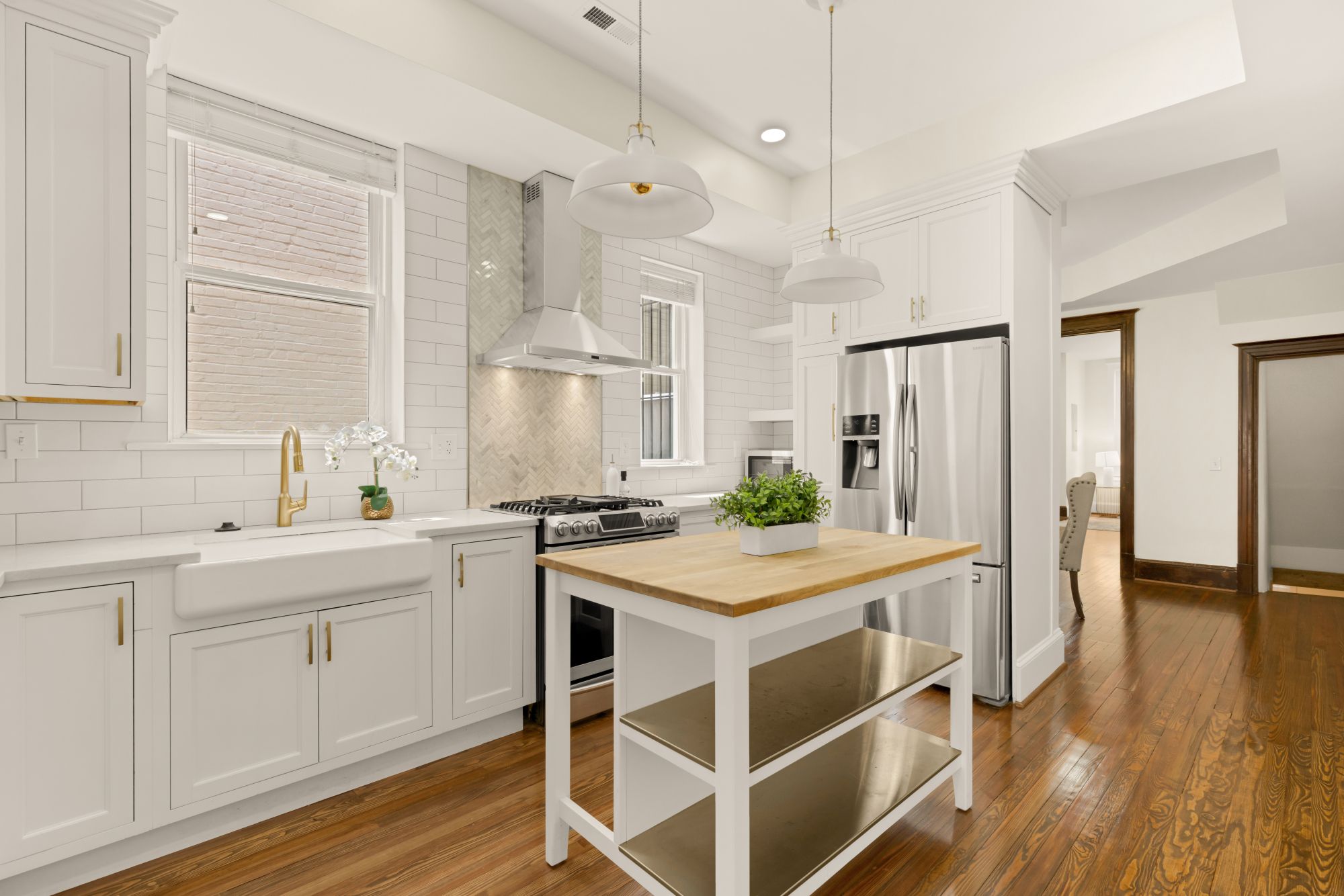 On the main level, original hardwood floors and detailed millwork ground the space, while high ceilings and tall windows bring in plenty of light. The kitchen was reimagined for both function and aesthetics - marble countertops, 48” cabinets, counter-to-ceiling backsplash with a herringbone accent, and a butcher block island that adds warmth without trying too hard. There’s a powder room tucked off the main hall, and a seamless flow from living to dining to kitchen.