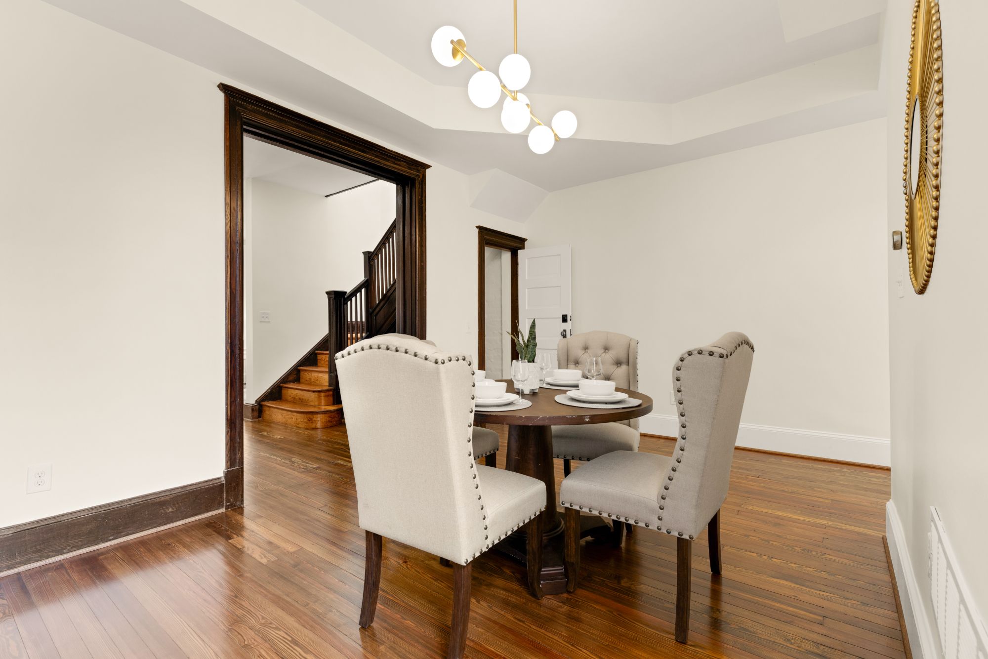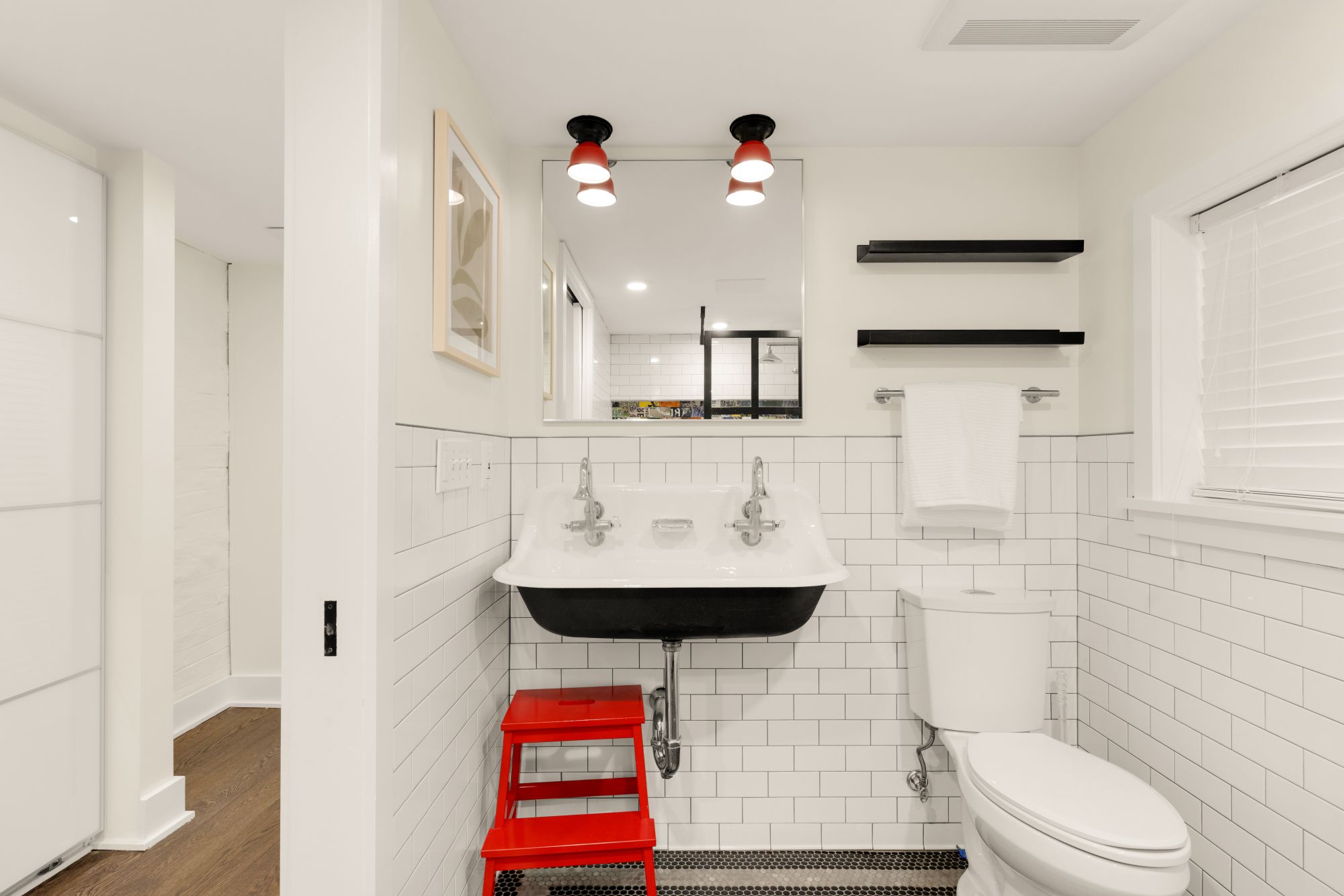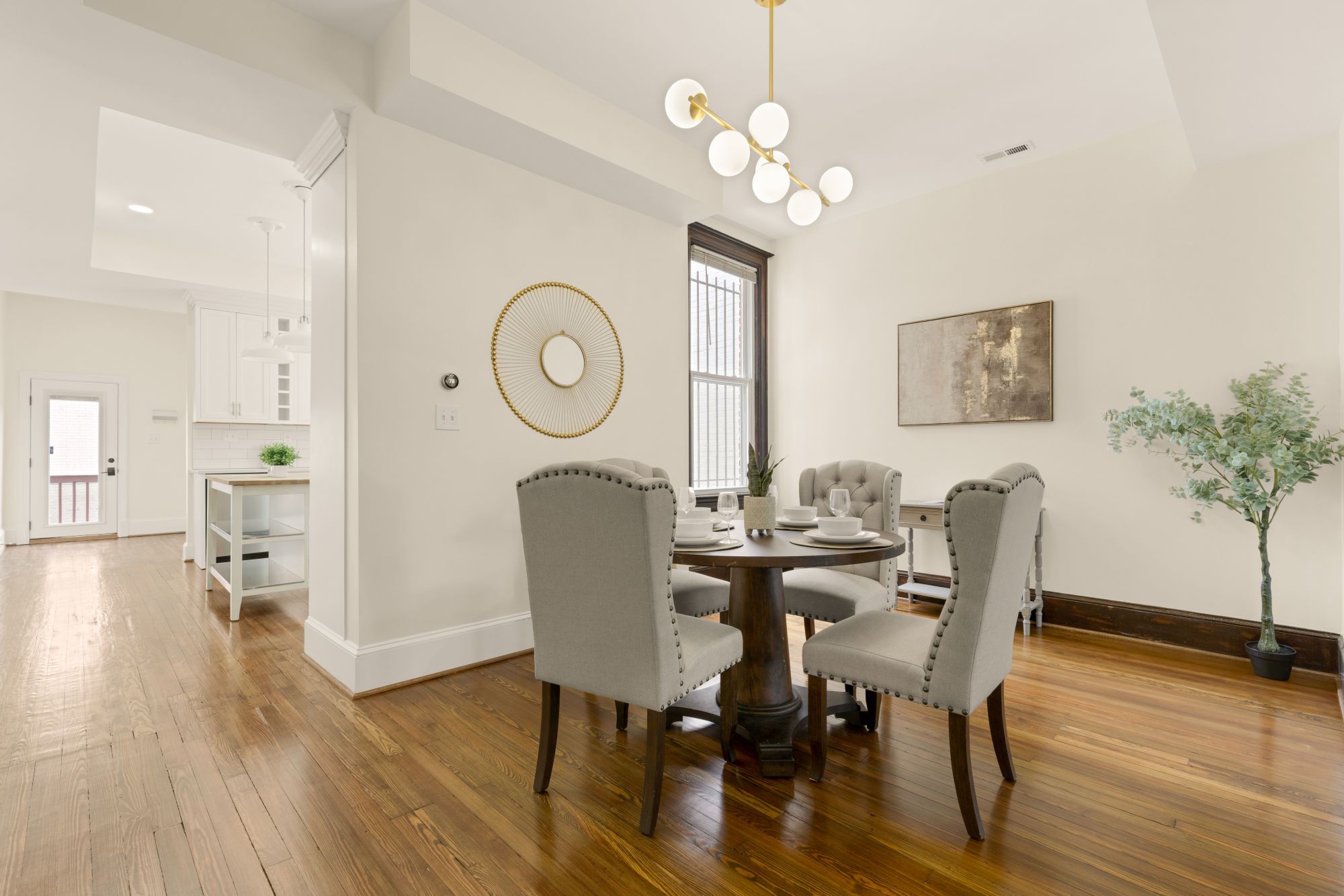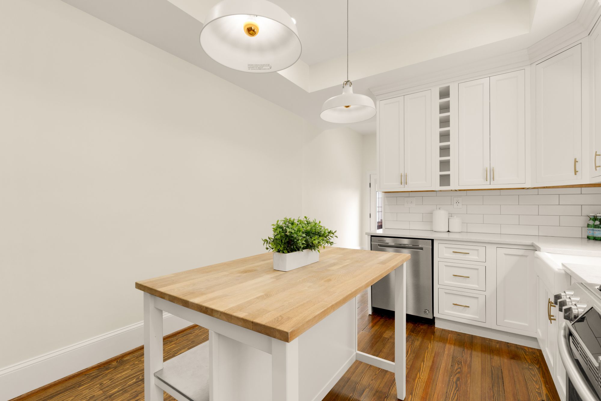 On the main level, original hardwood floors and detailed millwork ground the space, while high ceilings and tall windows bring in plenty of light. The kitchen was reimagined for both function and aesthetics - marble countertops, 48” cabinets, counter-to-ceiling backsplash with a herringbone accent, and a butcher block island that adds warmth without trying too hard. There’s a powder room tucked off the main hall, and a seamless flow from living to dining to kitchen.