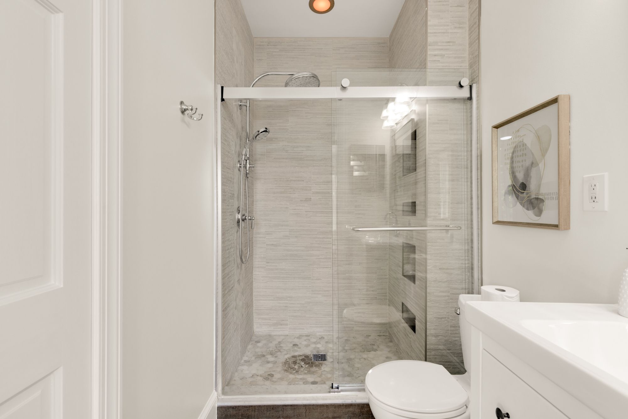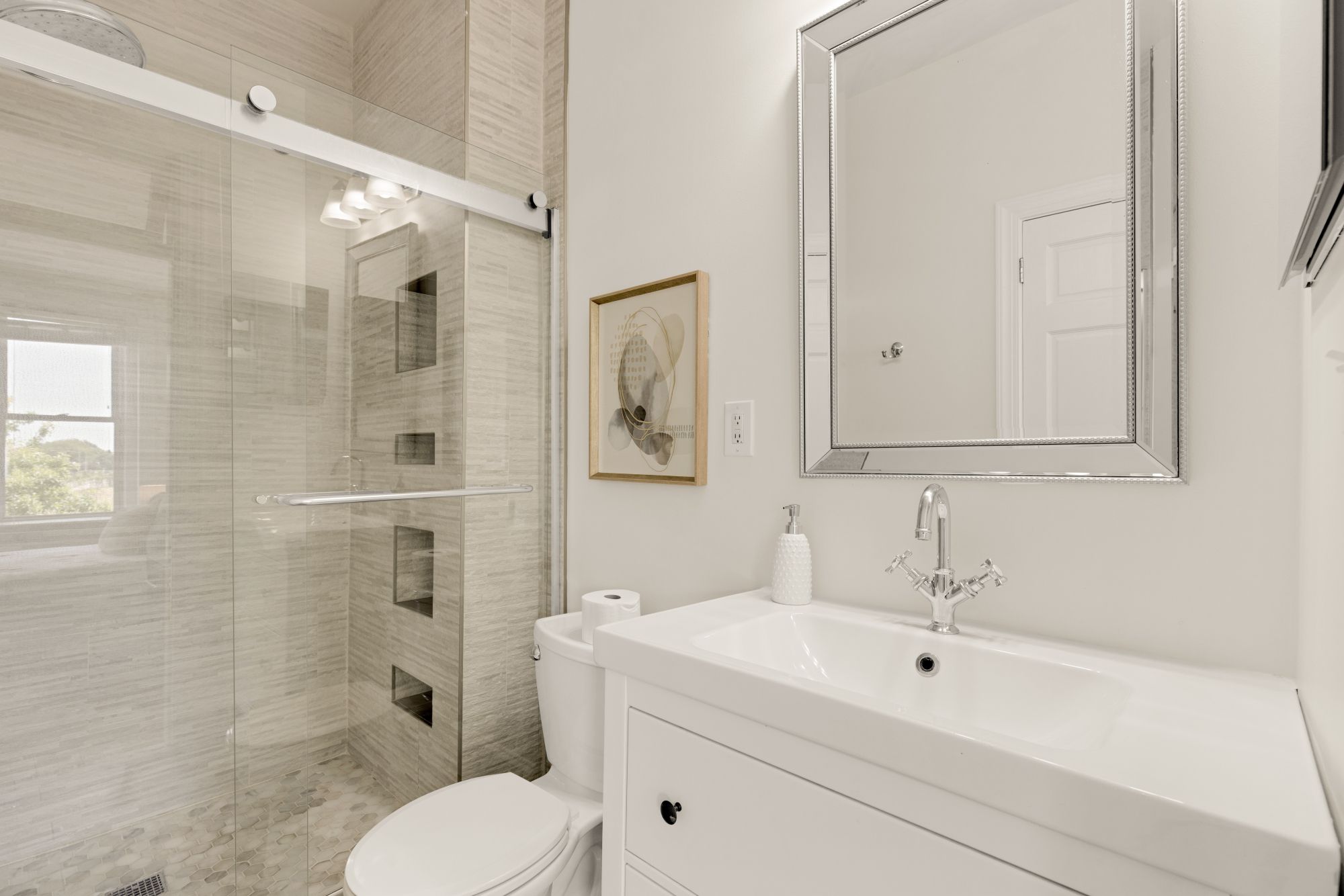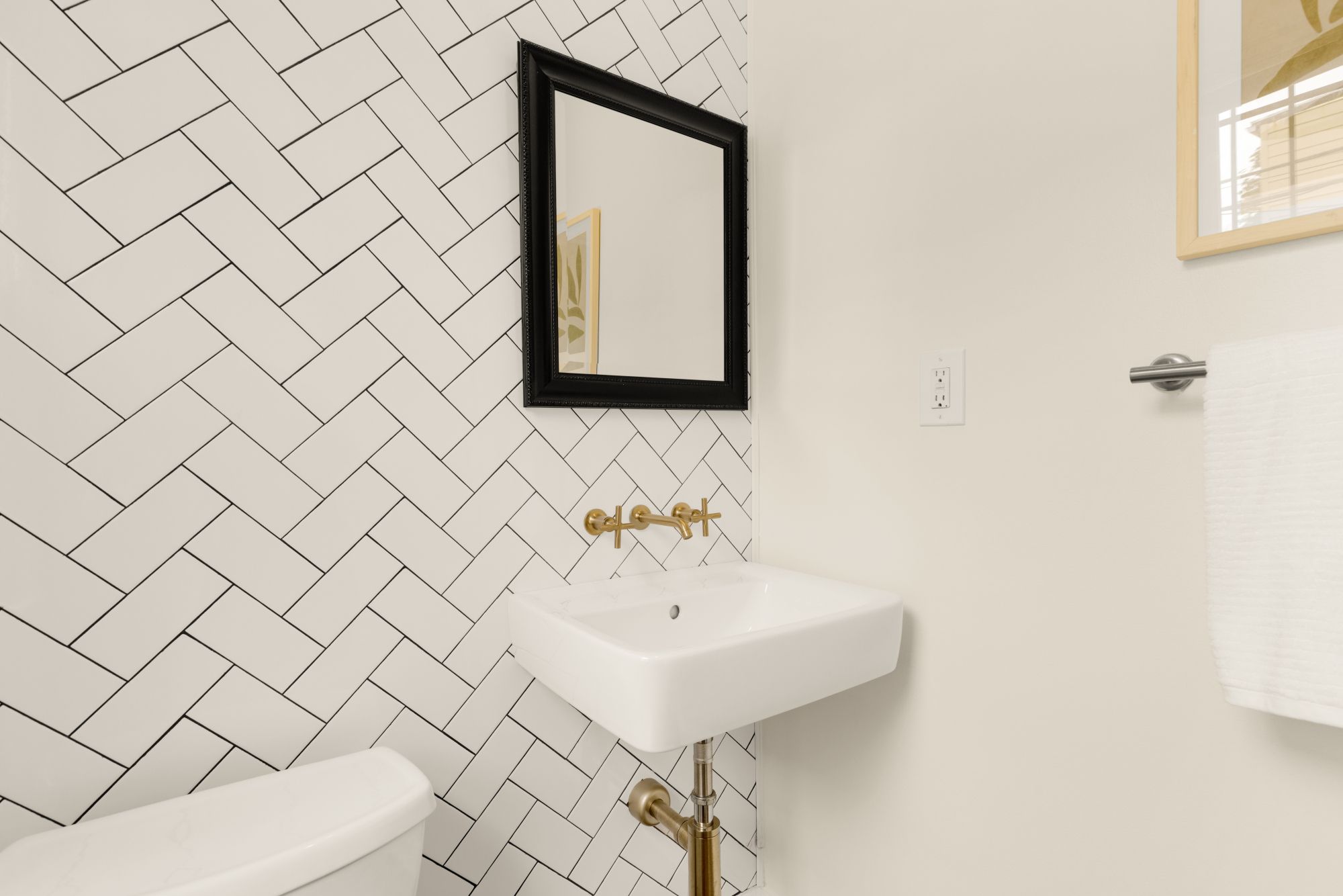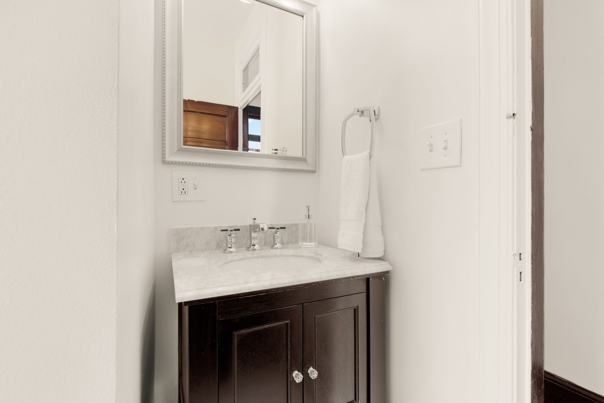 On the main level, original hardwood floors and detailed millwork ground the space, while high ceilings and tall windows bring in plenty of light. The kitchen was reimagined for both function and aesthetics - marble countertops, 48” cabinets, counter-to-ceiling backsplash with a herringbone accent, and a butcher block island that adds warmth without trying too hard. There’s a powder room tucked off the main hall, and a seamless flow from living to dining to kitchen.